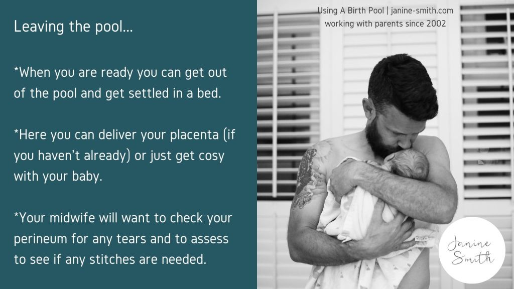 - Your midwife can monitor you and your baby in the pool – if she becomes concerned about anything, she will ask you to get out of the pool.