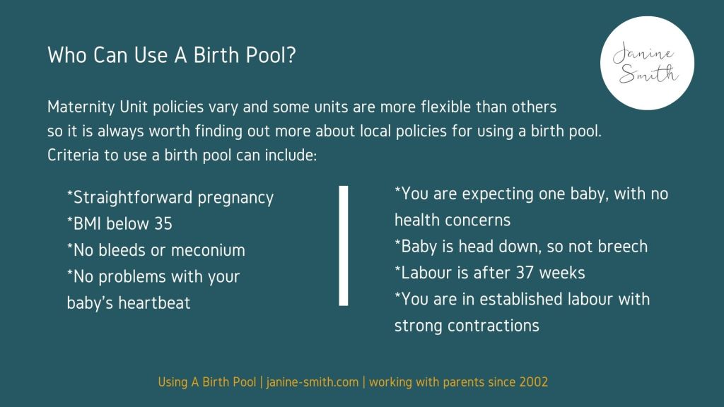 - You need to be classed as low risk to use the pool – so your blood pressure and temperature need to be normal, as does your baby’s heart-rate.
