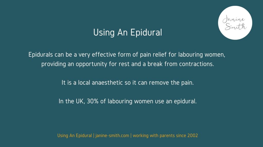 This is a local anaesthetic which is administered into the spine by an anaesthetist. This pain relief can be very effective, removing the pain of contractions. 30% of labouring women use an epidural. It can be used in established labour until your contractions are very close together, when it may be too difficult to administer.