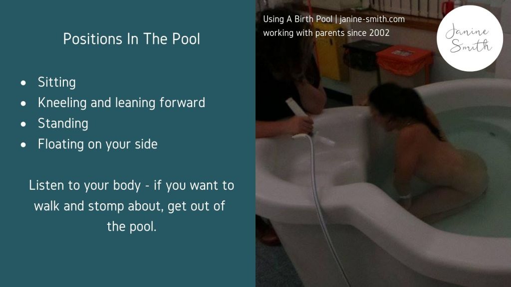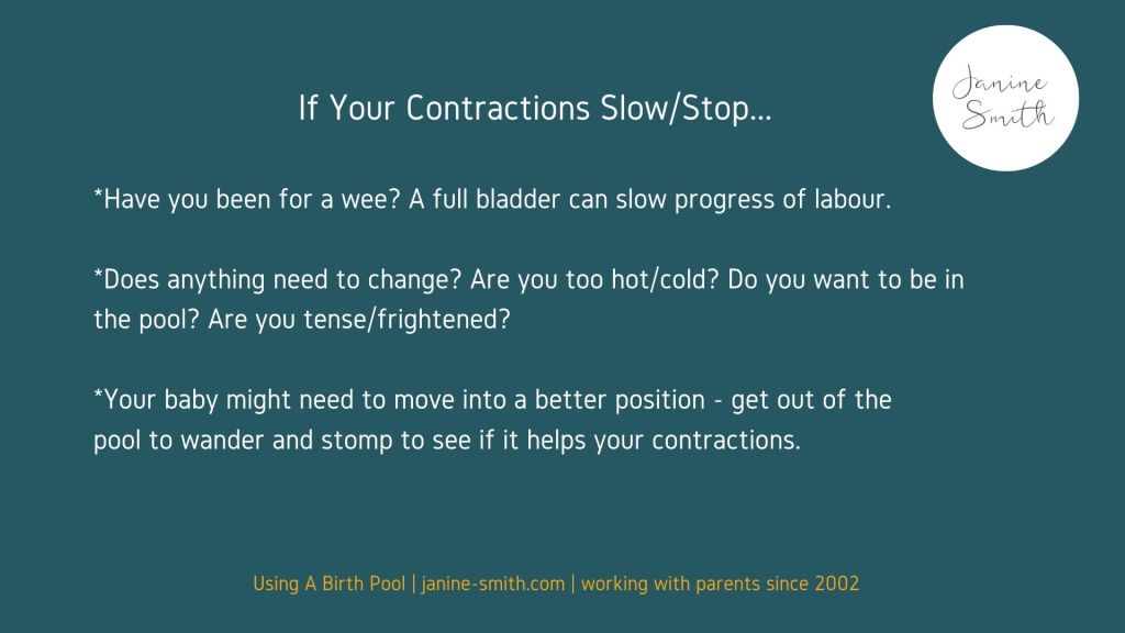 - If your contractions slow down when you are in the pool, you may need to change position or get out and walk about for a while.