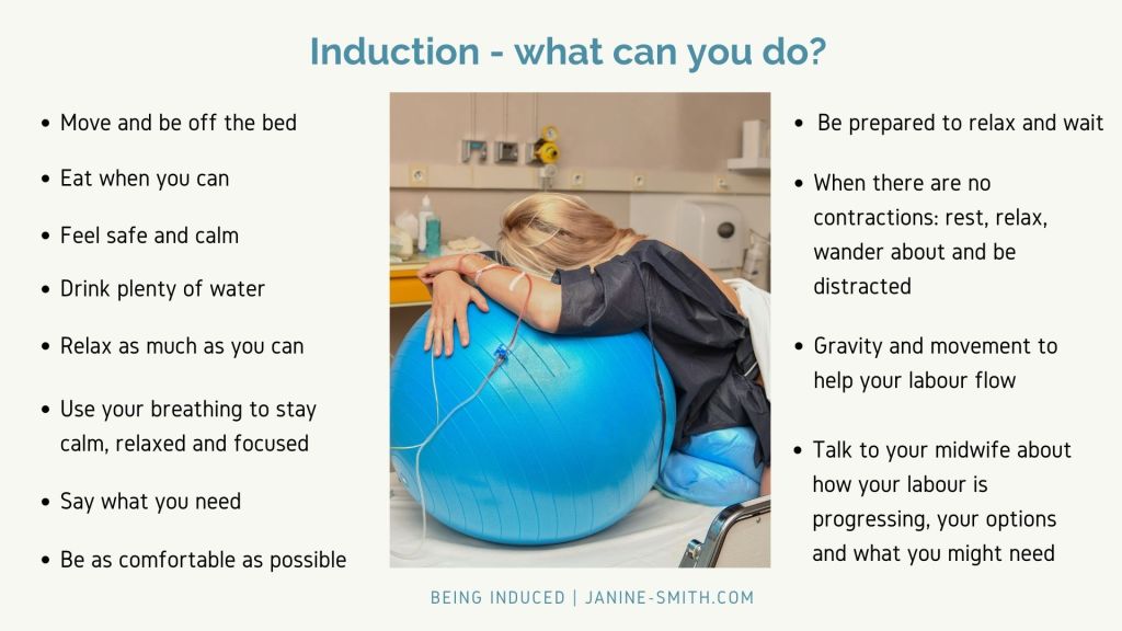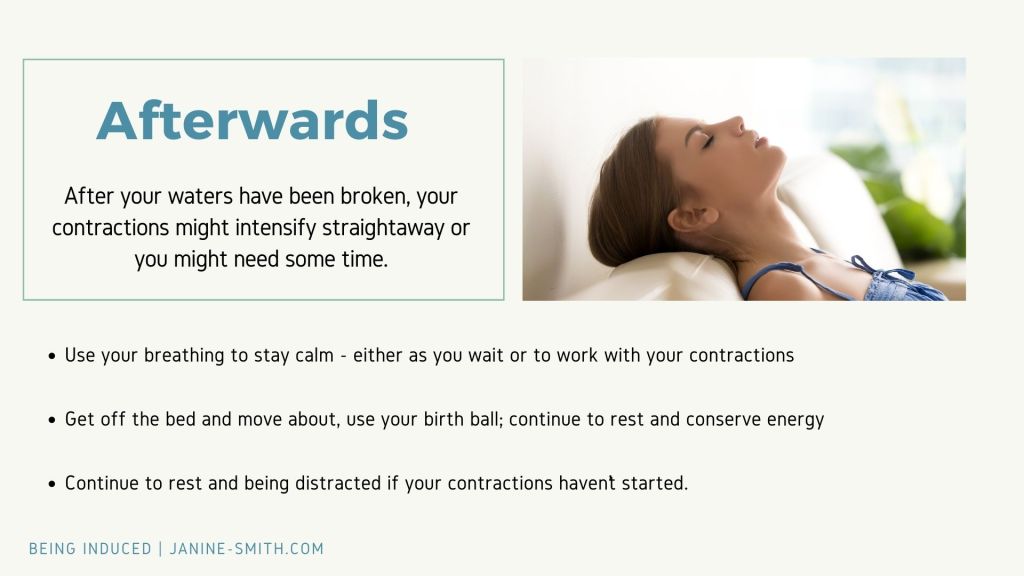 Afterwards: Use your breathing to stay calm and relaxed; get off the bed and move about, sit on your birth ball; rest and keep distracted if your contractions haven’t properly started.