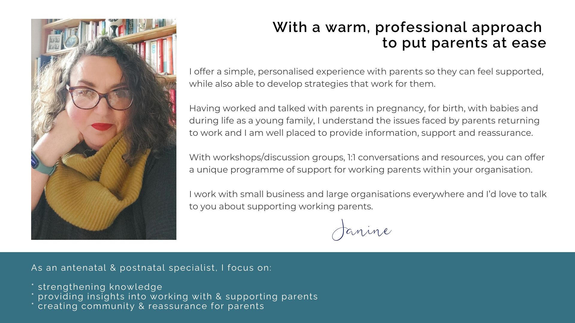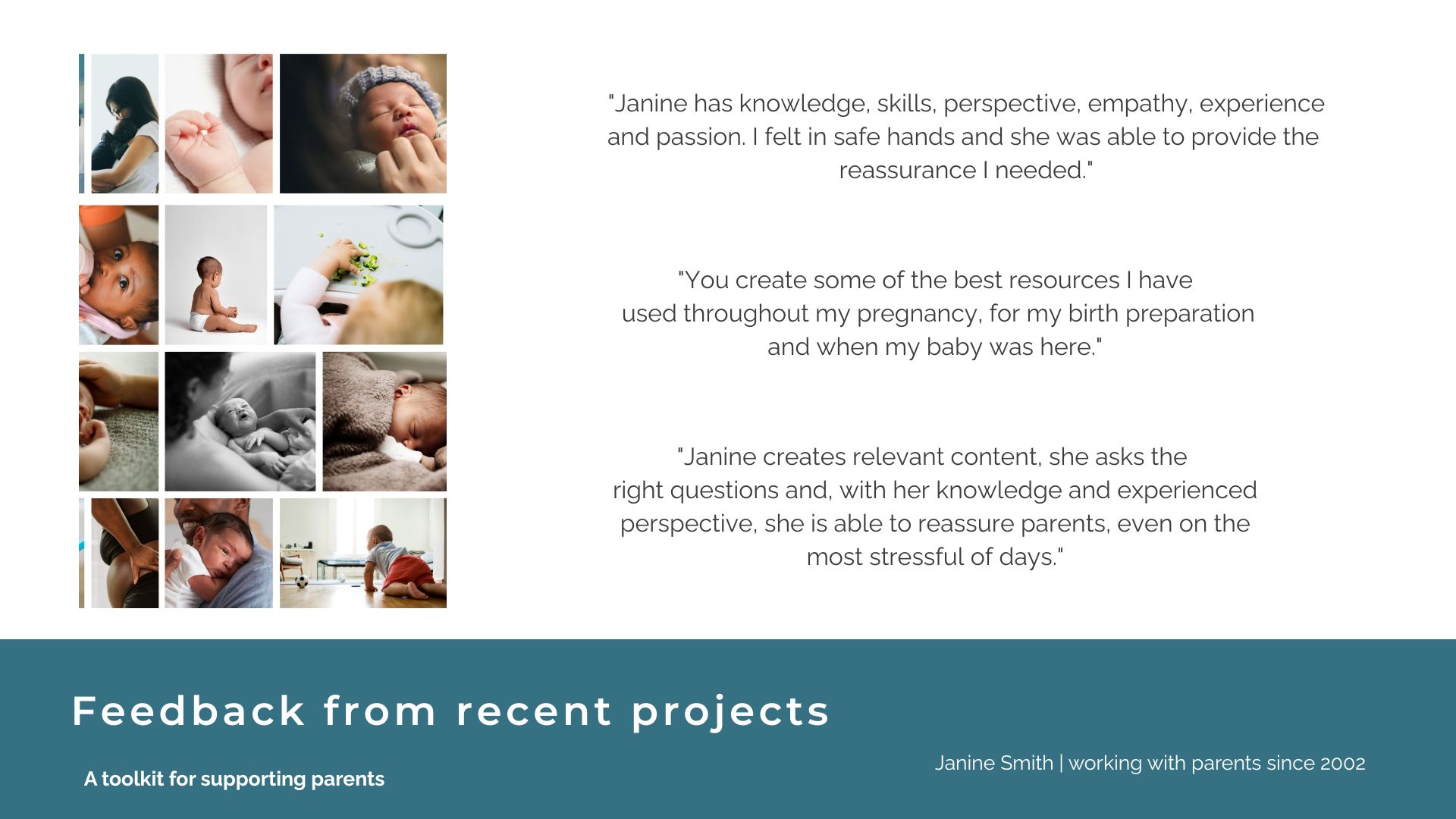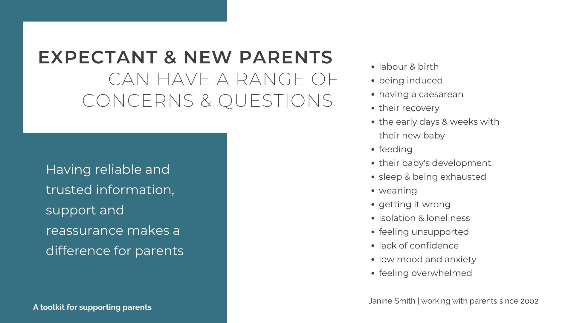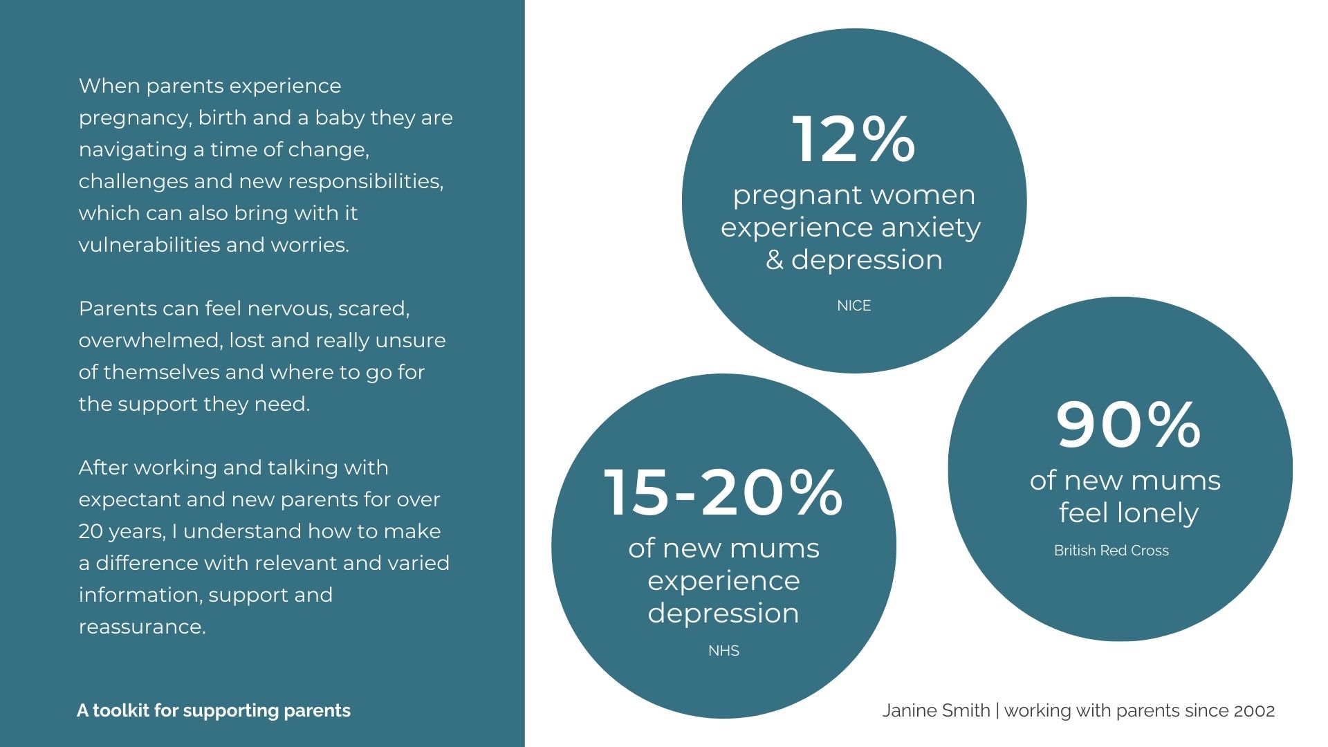 After working and talking with expectant and new parents for over 20 years, I understand how to make a difference with relevant and varied information, support and reassurance.