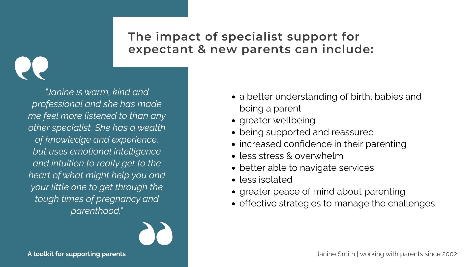 The impact of specialist support for expectant and new parents can include: a better understanding of birth, babies and being a parent, greater wellbeing, being supported and reassured, increased confidence and less stress, better able to navigate services, less isolated and greater peace of mind about parenting.