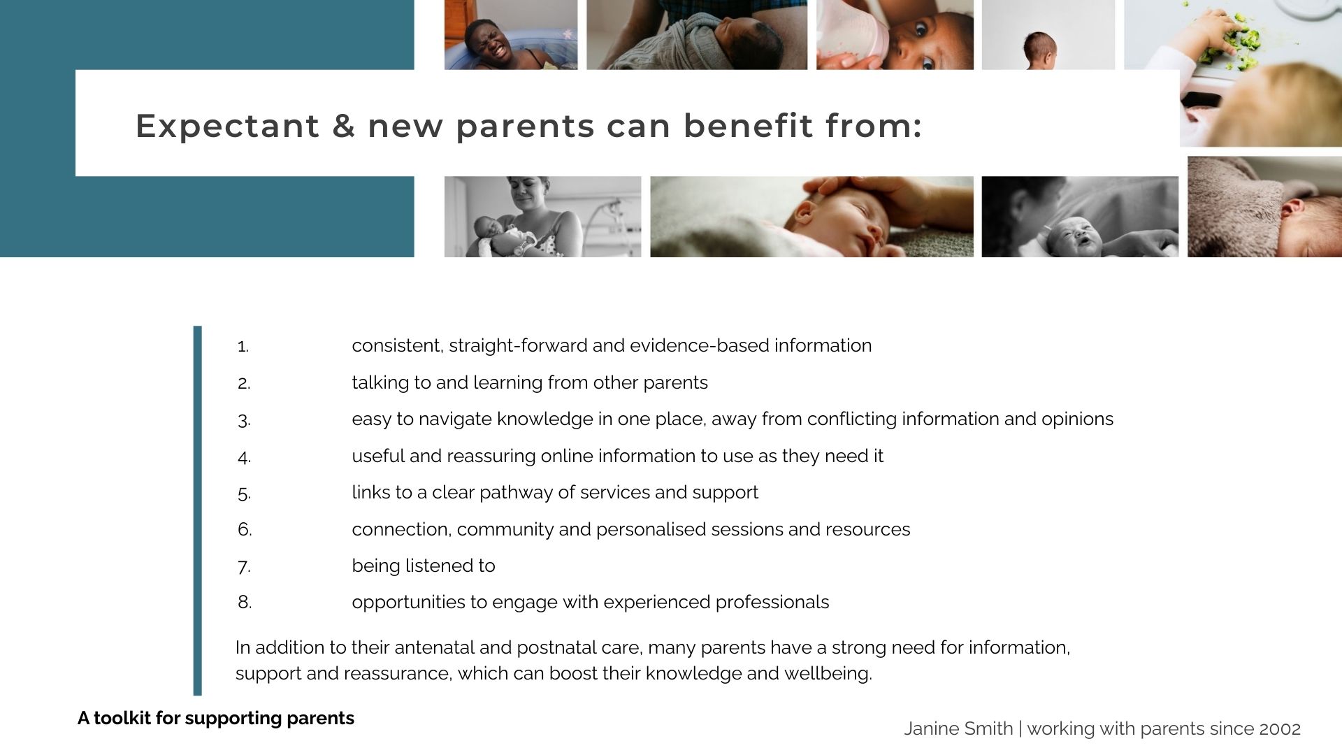 In addition to their antenatal and postnatal care, many parents have a strong need for information, support and reassurance, which can boost their knowledge and wellbeing.