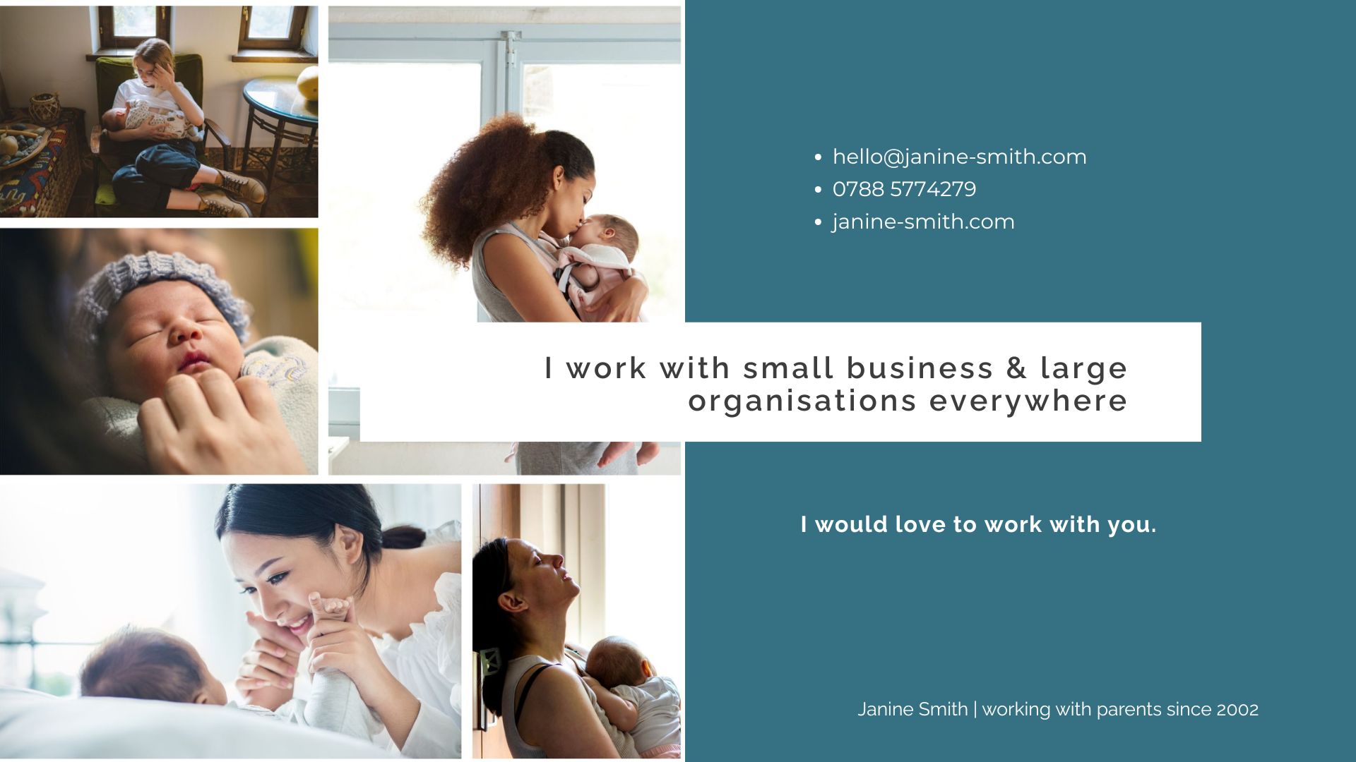 I work with businesses and organisations everywhere and I’d love to talk to you about supporting and working with expectant and new parents.