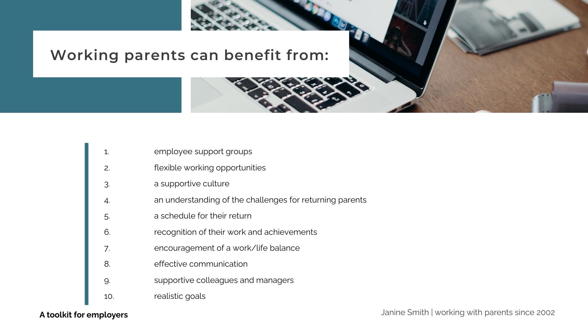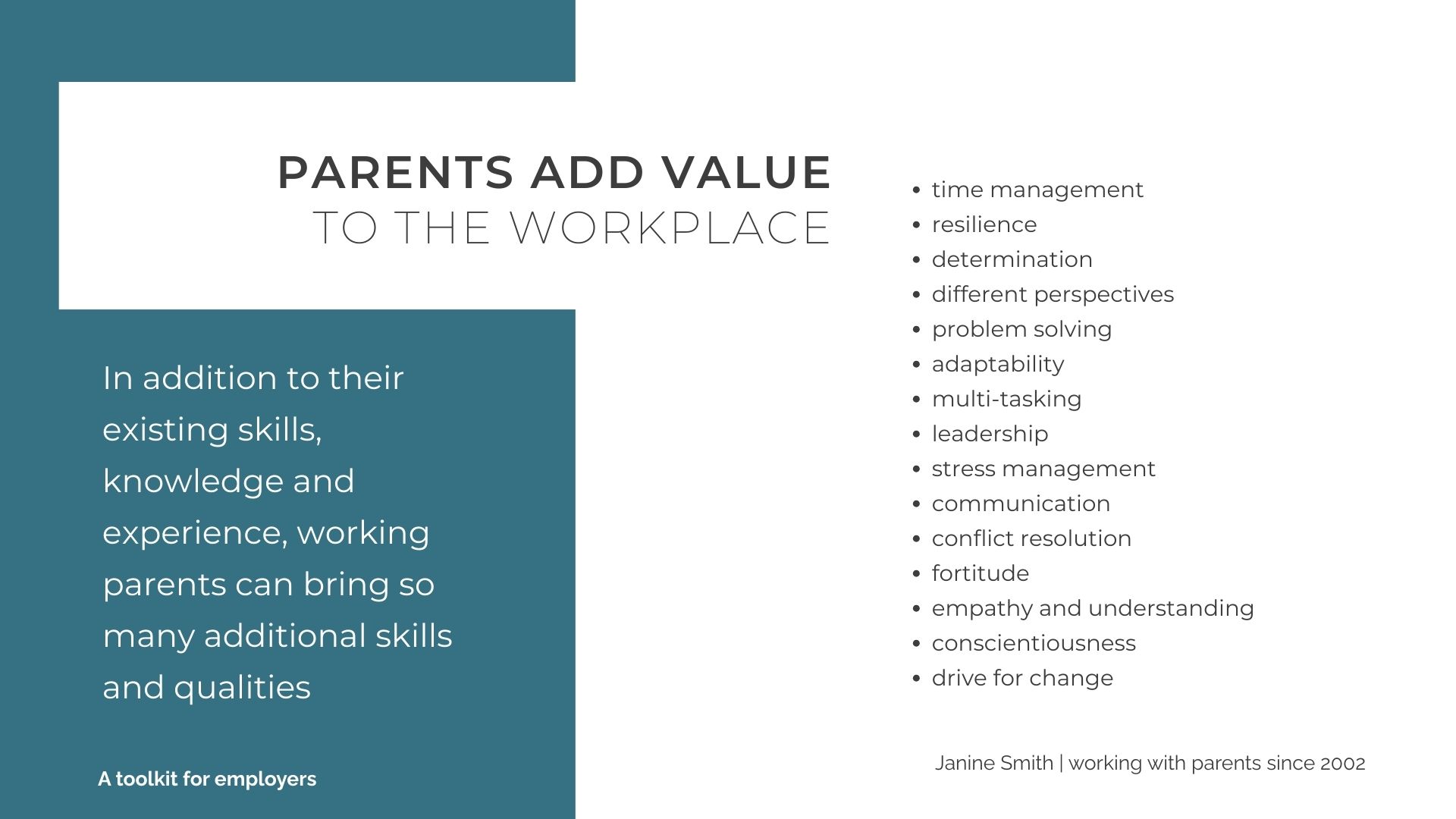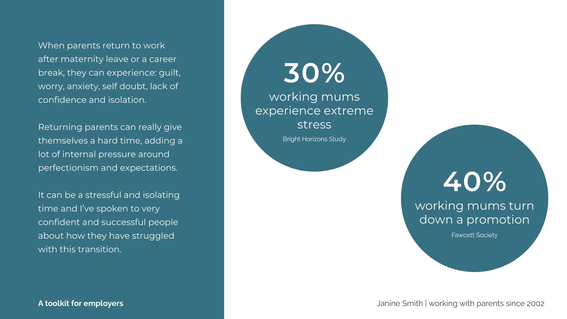 I work with small business and large organisations everywhere and I’d love to talk to you about supporting working parents.