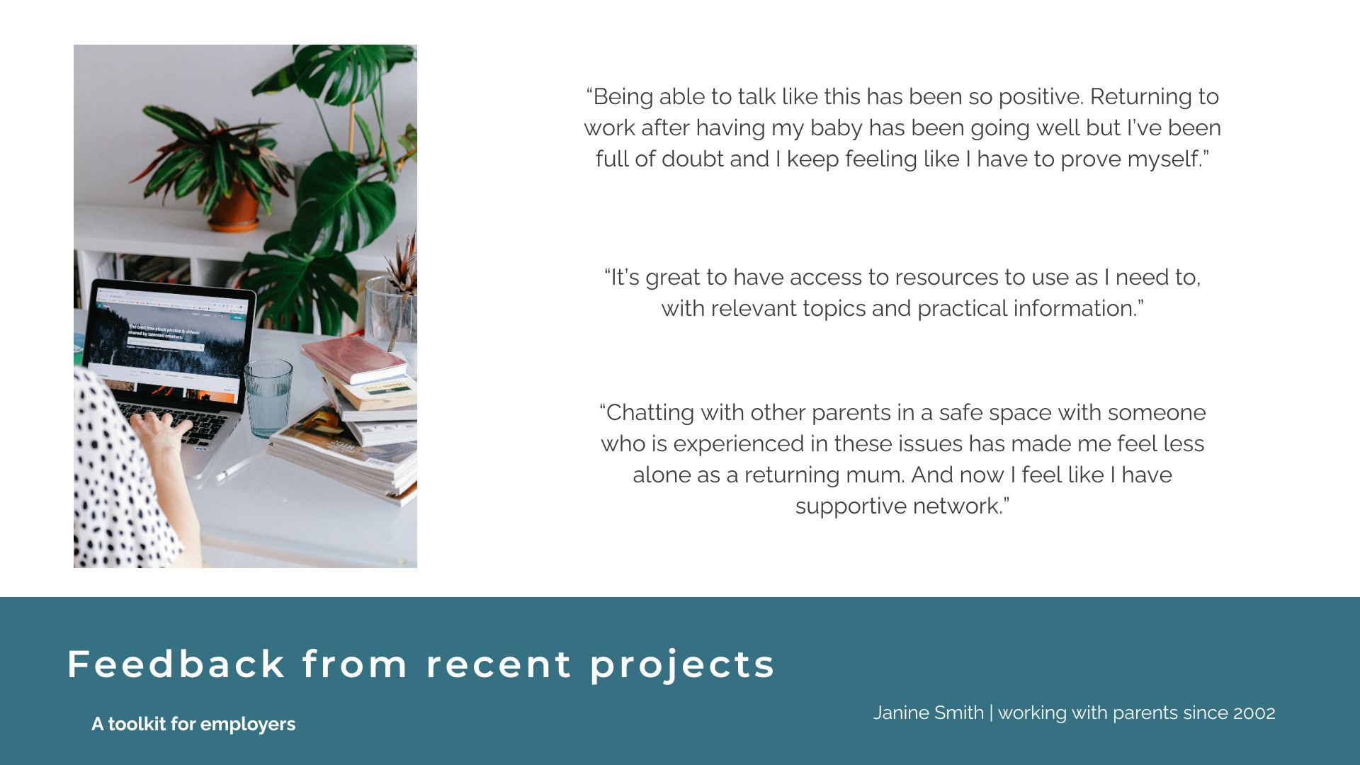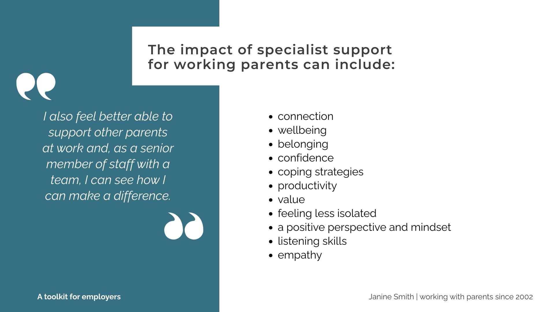 The impact of specialist support for working parents can include: connection, wellbeing, belonging, confidence, effective coping strategies, productivity, value, feeling less isolated and having a positive perspective and mindset.